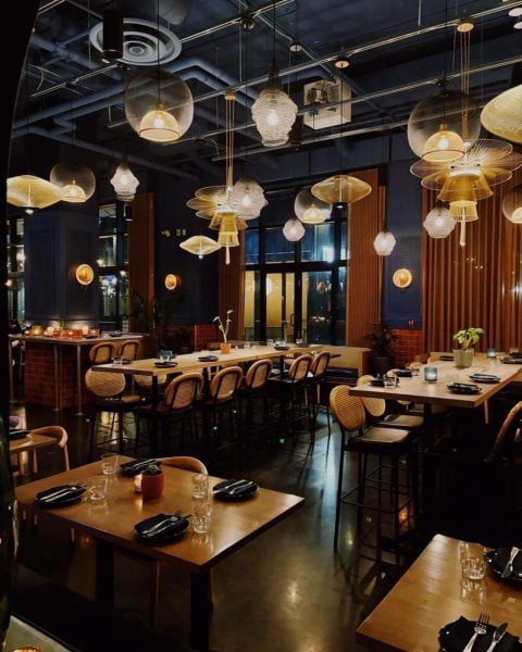 When you aren’t enjoying the nibbles, take in the sultry ambiance. Geometric lanterns hang from the ceiling. Wooden accents make it Scandi-chic. And the bar in the middle gives you a great view of it all.