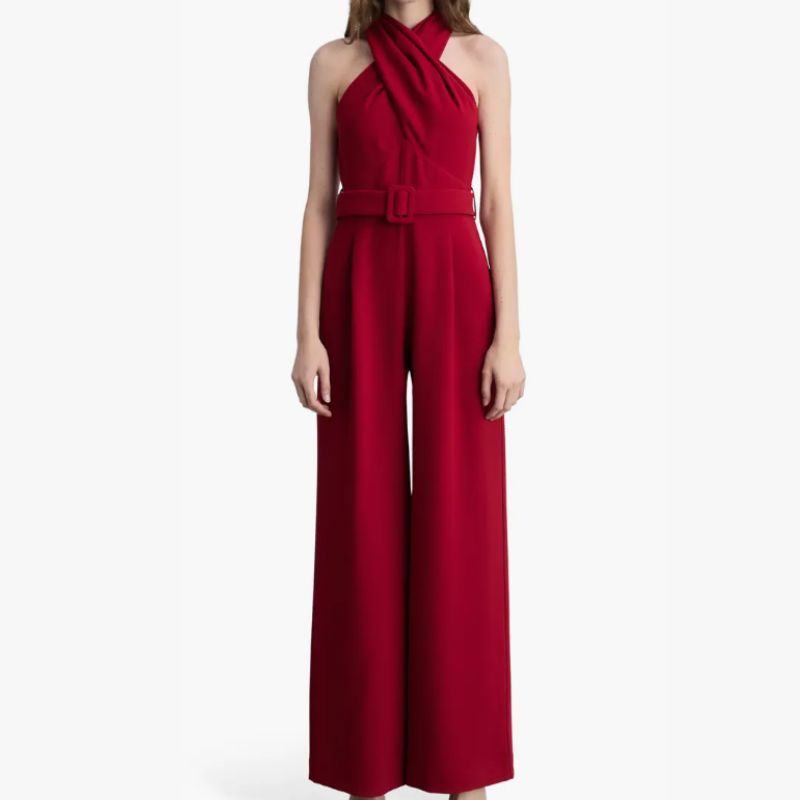 Skewing slightly more wine-red than burgundy, this jumpsuit is a brighter take on a warm and rich color like of that Amal’s one piece. The halterneck is a stunning design, with the wrap detail working like the frills on Amal’s jumpsuit to add subtle interest and texture.